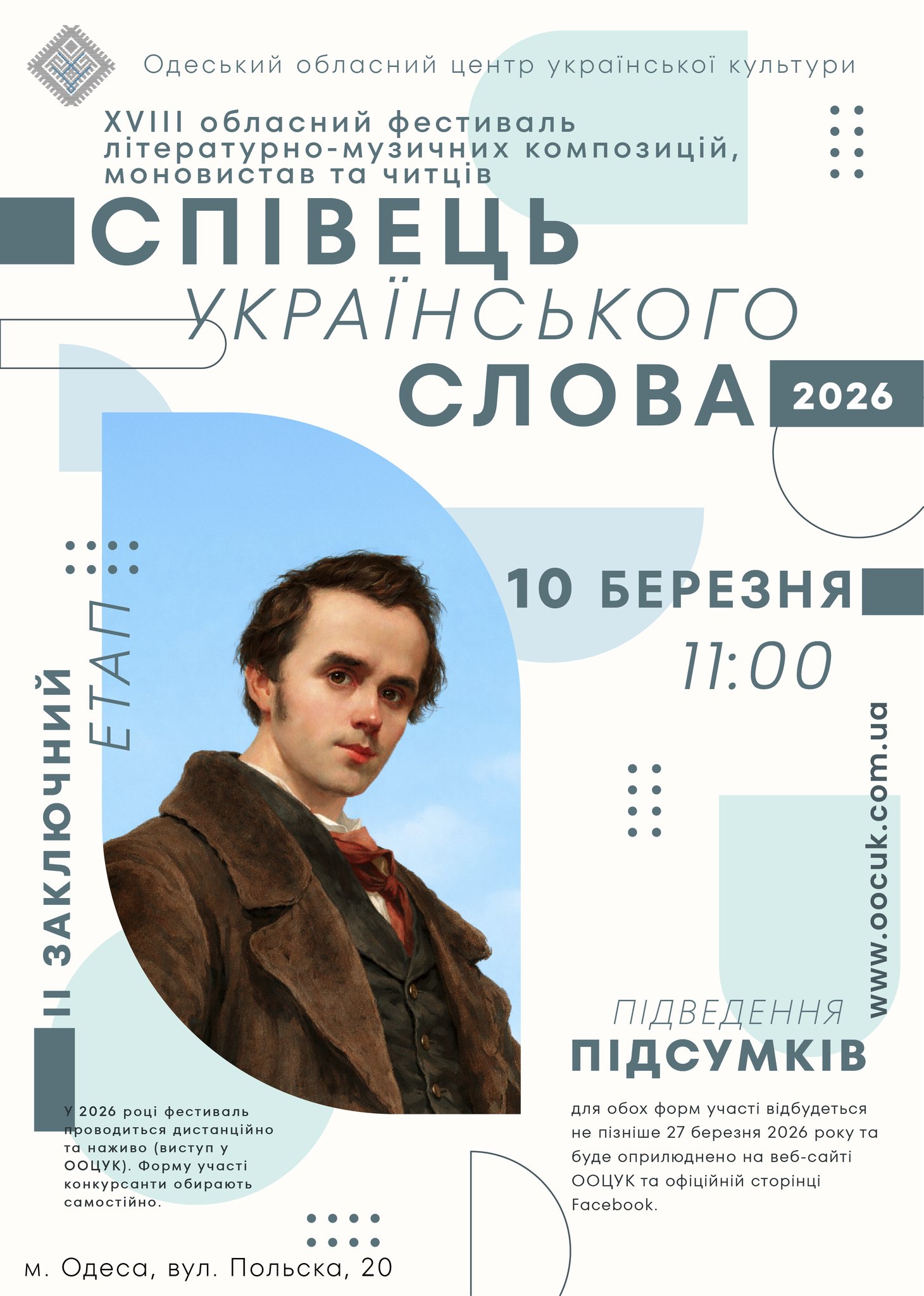 Умови проведення XVІІІ обласного фестивалю літературно-музичних композицій, моновистав та читців «Співець українського слова» Фестиваль проводиться Одеським обласним центром української культури за підтримки Департаменту культури, національностей,